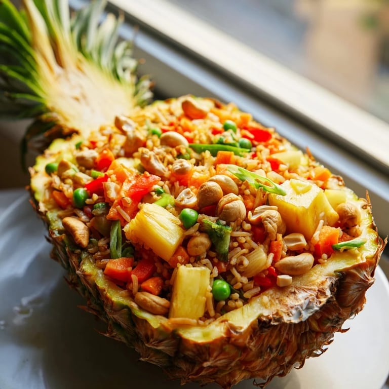 Save to Pinterest I discovered pineapple fried rice on a sticky Bangkok evening when the air conditioning had died and my friend's grandmother refused to let me order delivery. She pulled a pineapple from her windowsill, carved it open with practiced efficiency, and suddenly the kitchen smelled like caramelized garlic and tropical fruit. Twenty minutes later, I was eating the best thing I'd tasted that summer, spooned straight from a hollowed shell that doubled as both plate and centerpiece. It taught me that sometimes the most memorable meals come from constraints rather than perfection.